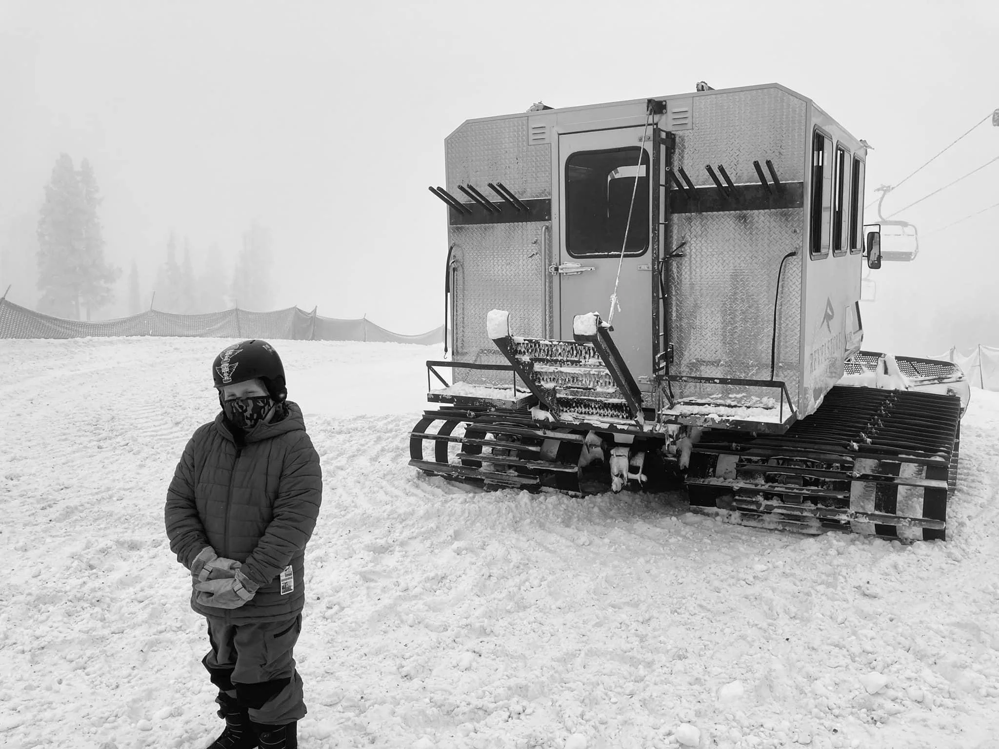 Snowboarder Leo “LJ” Weir outside the snowcat people mover on January 23, 2022. Photo by Jayme Weir.